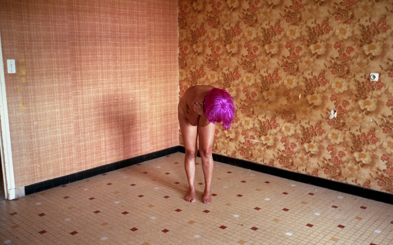 Je choisis mes poses en fonction des détails de l’intérieur. Mon corps se confond avec les murs donnant une impression de se fondre dans la bâtisse en ruines. Je ne fais plus qu’un avec la structure délabrée et je prends plaisir à devenir l’objet de présence d’un entre-deux. Je jouis de me perdre dans la maison sinistre tout en contemplant mon égarement, une certaine évanescence m’envahit je cherche la perte de l’identité.