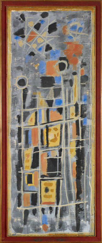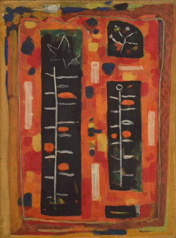 Bissière est à la recherche « d’une nouvelle définition de la peinture » et en 1954, lors d’un séjour à Paris, il redécouvre la peinture à l’huile. Il retrouve toutes les subtilités des transparences et des glacis tout comme le jeu du clair-obscur qu’il explorera durant dix ans en abandonnant toute référence à une quelconque figuration. Ses toiles s’inscrivent dans des formats davantage équilibrés et plus grands. Les signes noirs rythment des plages colorées, se densifient pour former une trame de plus en plus dense et serrée.