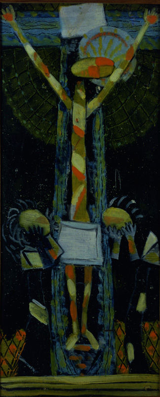 Dans un format étroit et tout en hauteur, les personnages figés, se plient au format qui les accueille. Le sujet religieux de la crucifixion, absent jusque-là dans l’œuvre de Bissière, va de pair avec un nouvel accent porté sur l’expressivité. Le peintre traduit la douleur physique du crucifié et la souffrance des personnages – Marie, Jean et Marie-Madeleine – dans un langage qui ne cite pas seulement Grünewald, mais aussi la peinture de Picasso et la sculpture africaine.