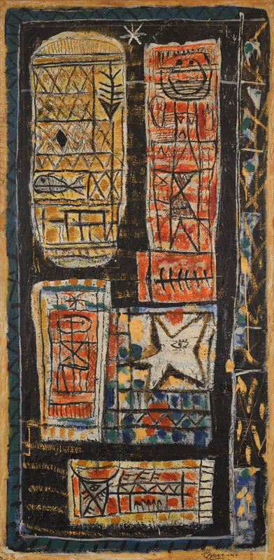 Après l’exposition monographique que lui consacre la galerie Drouin, le dernier tableau qui clôt l’année 1947 et entame le nouveau cycle des peintures à l’œuf s’intitule Grande composition(1947, collection particulière). Le peintre élabore alors un langage dans lequel il inscrit des pictogrammes dans des fenêtres colorées. Le répertoire formel de ce cycle reste identique: homme, vache, plante, poisson, étoile, « mais il ne s’agit plus de la transcription d’un univers vu à travers la candeur de la vision enfantine mais d’un basculement vers le monde primitif. L’élaboration d’une écriture première, d’un répertoire de pictogrammes, tout comme le choix de l’oeuf comme médium ancrent Bissière du côté des primitifs. » Dans Jaune et gris (1950, Mnam, Centre Georges Pompidou), un des principaux tableaux du groupe, les signes simples exécutés avec un pinceau large semblent inspirés des motifs de la peinture rupestre.