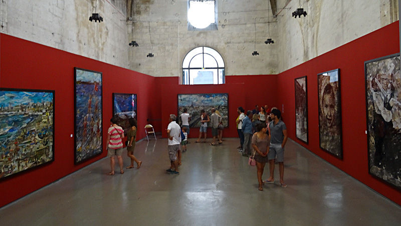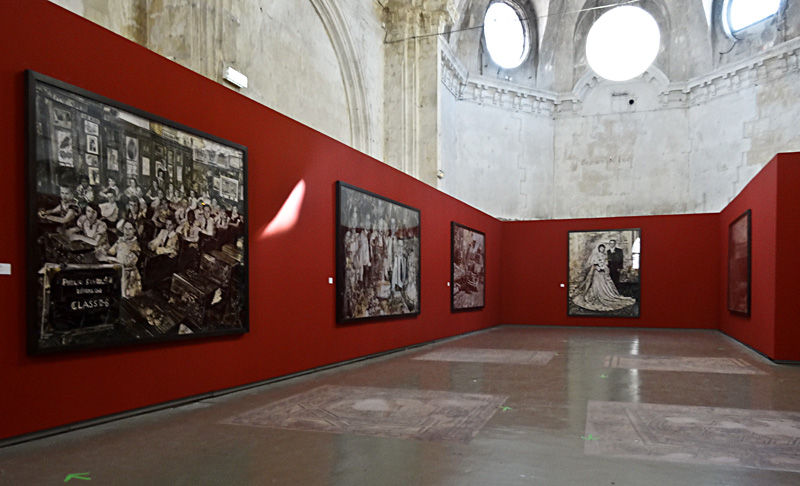 Des cimaises au rouge Pompéi supportent un accrochage très sobre qui sépare les deux séries. La lumière naturelle qui tombe de hautes fenêtres de la nef et de l’abside est complétée par un éclairage discret qui n’évite pas quelques reflets déplaisants.