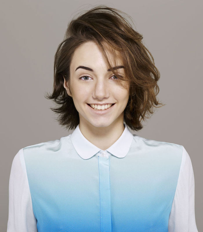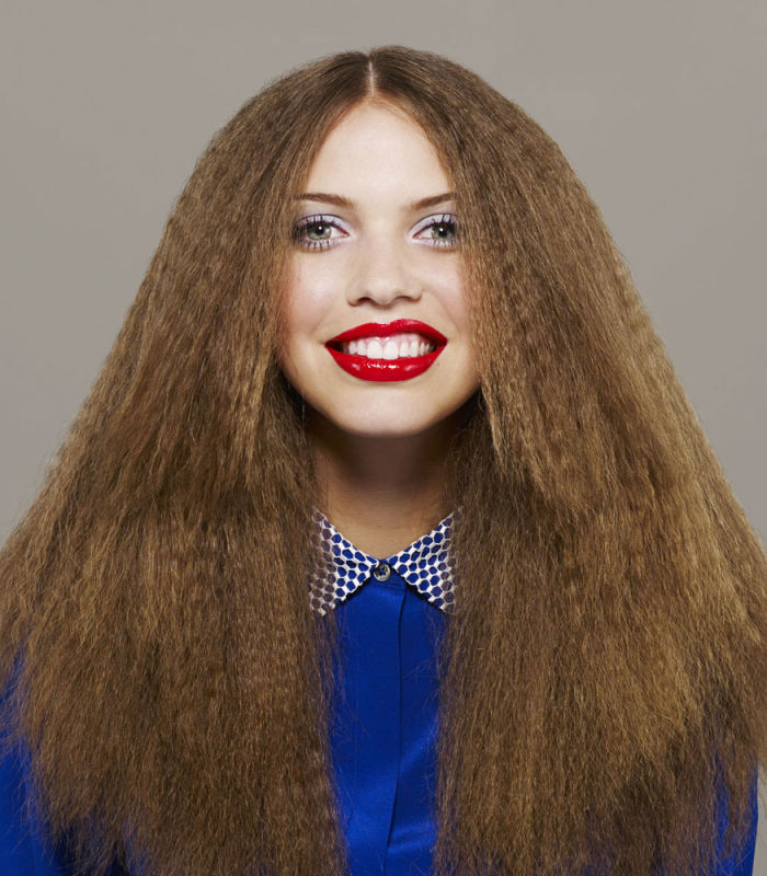 Le travail photographique se compose, quant à lui, de séries de trois clichés. La règle est simple : un mannequin, trois coiffures, trois types de maquillage et trois styles vestimentaires. Le dénominateur commun de ces ensembles est le sourire, strictement identique d’une image à l’autre. Jouant pleinement avec les pratiques de la mode, la photographe transforme les mannequins jusqu’à les rendre méconnaissables. Dans le même temps, elle fonde curieusement les identités sur la permanence de leur sourire. Ce dernier, naturel dans le premier cliché, trouve deux échos successifs similaires au prix d’une observation fine et d’une interprétation rigoureuse de soi-même. Sorte de clonage visuel, à mi-chemin de la manière et de l’affectation, cette répétition forcée vide le corps réel de sa substance. Le désincarne, le dévisage.