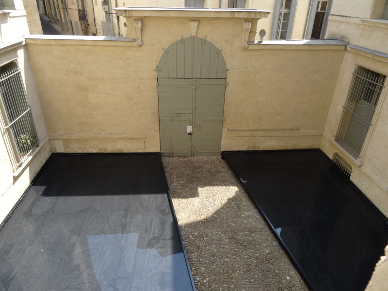 Pour ce dixième anniversaire, l’équipe du FAV a offert trois « cartes blanches » à d’anciens participants du festival qui propose leurs regards avec des installations exposées salle Lapeyronie à l’hôtel de Saint Côme (voir article ici). Le pavillon du FAV, dans la cour de cet hôtel, a été confié NAS Architecture, une jeune agence montpelliéraine qui nous avait particulièrement séduit l’an, dernier à La Grande-Motte. Ce pavillon est une très belle réussite qui offre des perspectives inédites sur le bâtiment qui l’accueille. N’hésitez pas à en faire plusieurs fois le tour, à vous installer sur les gradins, à prendre le temps… d’agréables surprises sont au rendez-vous du regard curieux !