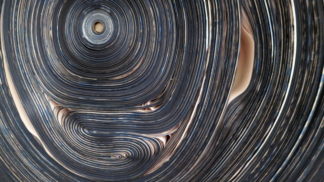 À partir d’un protocole assez simple (un odomètre, une bande de papier pour ticket de caisse de 57 mm de largeur et parfois un peu de pigments), il obtient des résultats plastiques parfois surprenants.