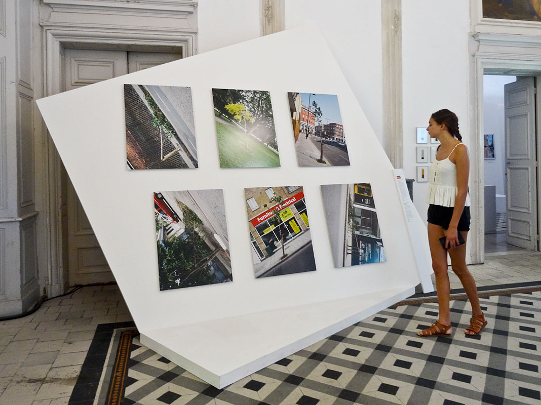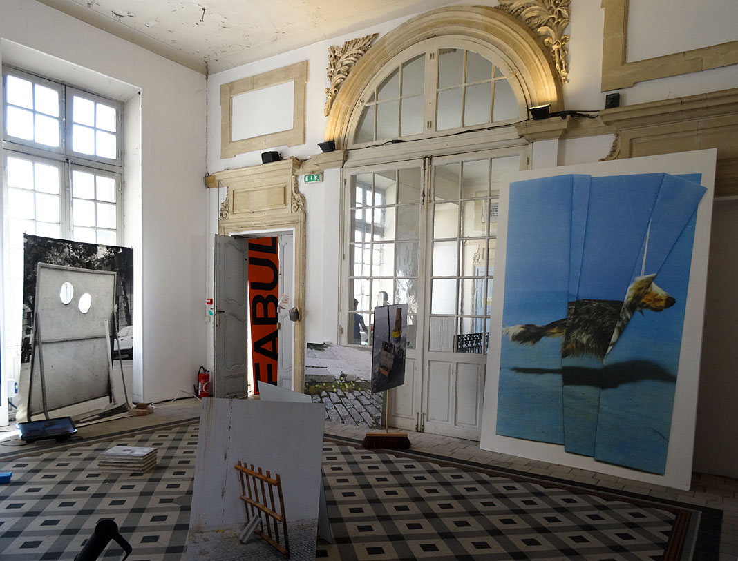 L’accrochage est aussi iconoclaste : Ici, les photographies sont suspendues au plafond. Là, elles s’appuient, en équilibre instable, contre un mur, un radiateur, une fenêtre ou sur le manteau d’une cheminée. Un peu plus loin, elles participent à une installation précaire maintenue par quelques bouts de planche ou par un balai de chantier…