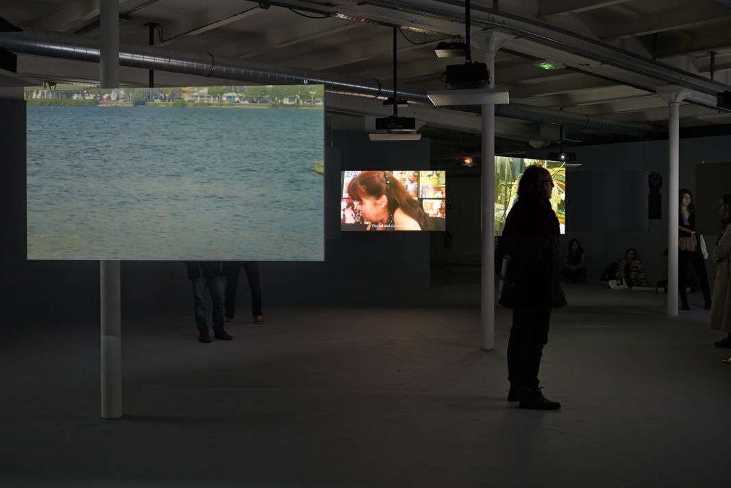 Cette boucle vidéo ouvre un large espace où sont présentés trois installations à double projection.