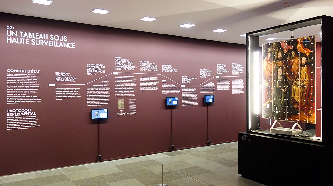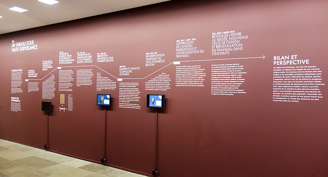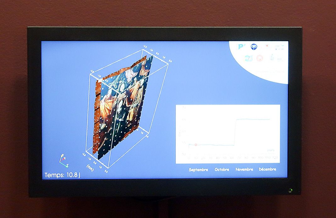 Grâce à ces différentes données, les mouvements du panneau équipé de son cadre, puis libéré de son cadre, et enfin libéré de son parquetage, ont pu être enregistrées. L’expérience se poursuivra le temps de l’exposition, permettant à terme de comprendre les secrets des mouvements d’une peinture sur bois, et de définir la solution qui assurera la pérennité de l’œuvre.