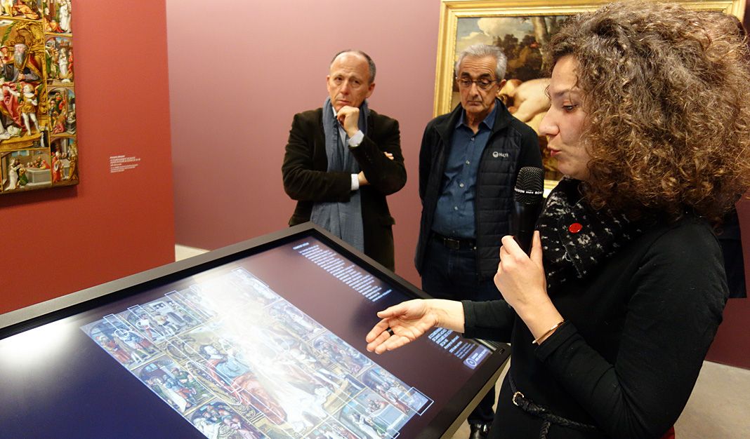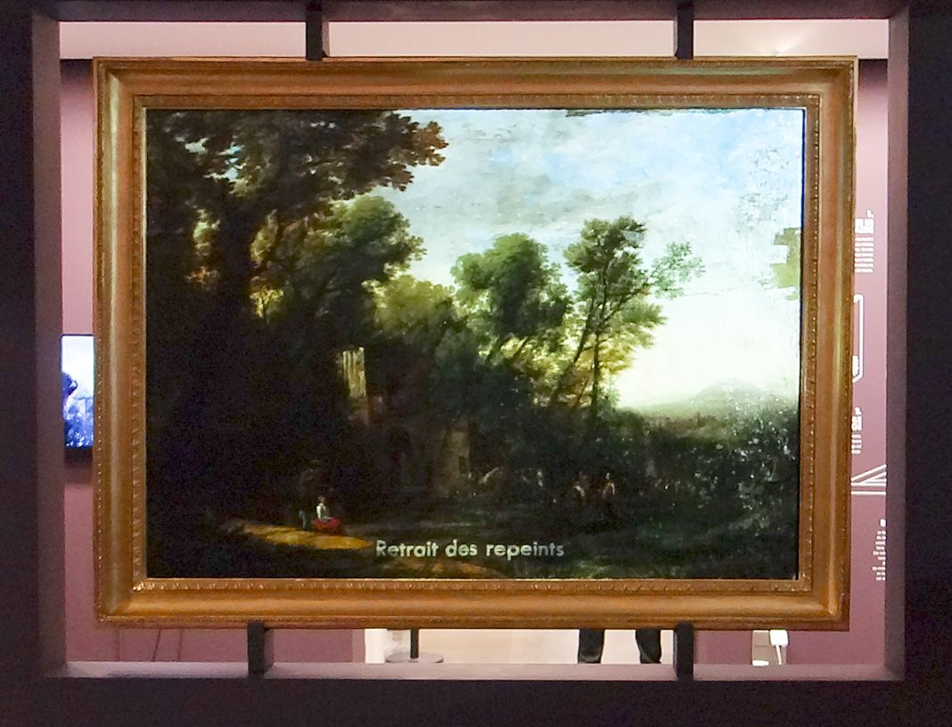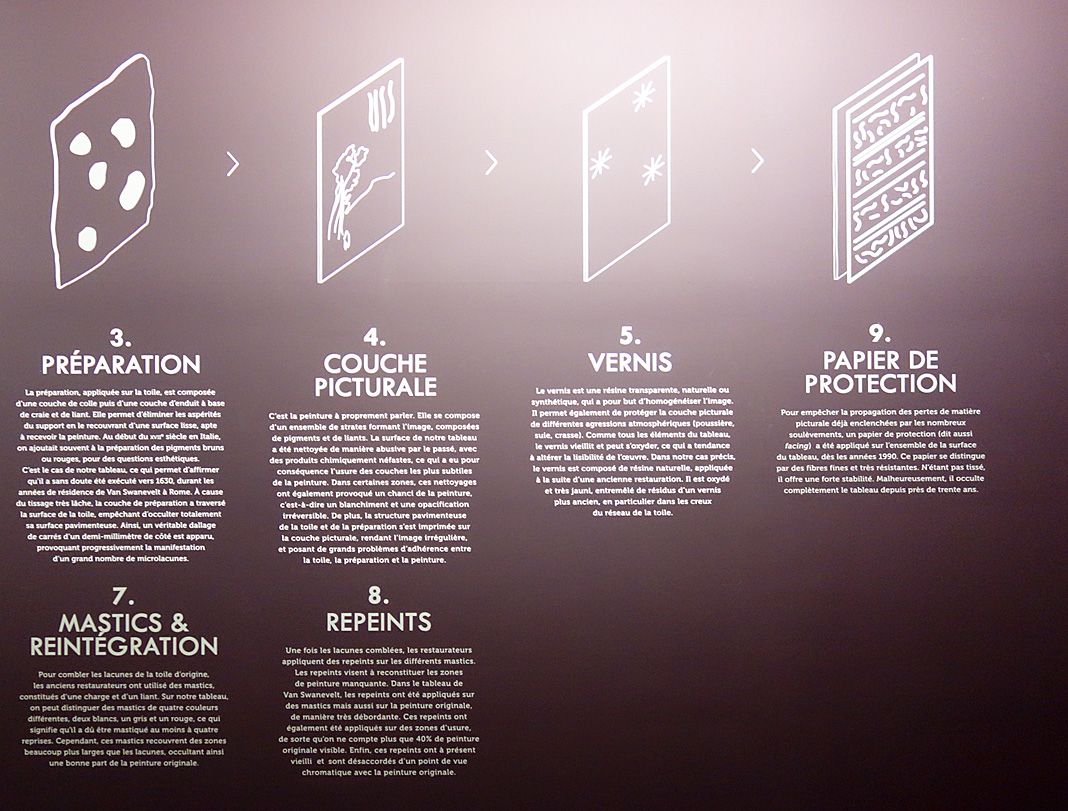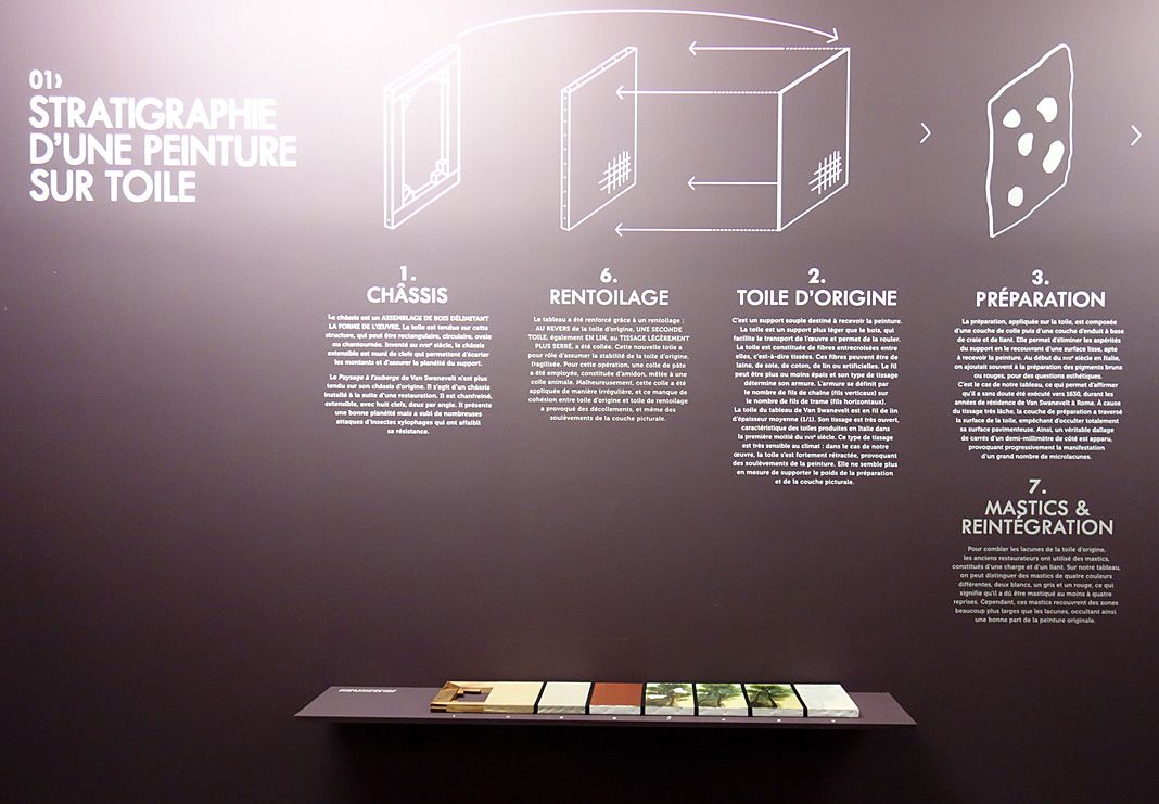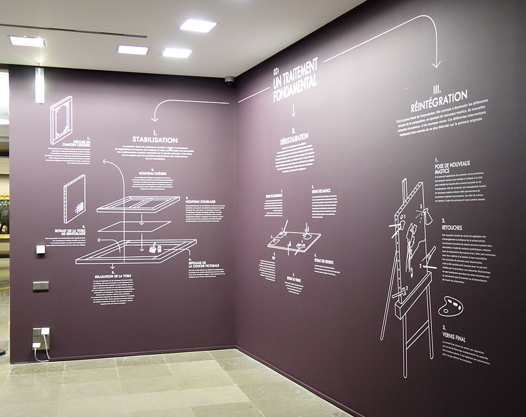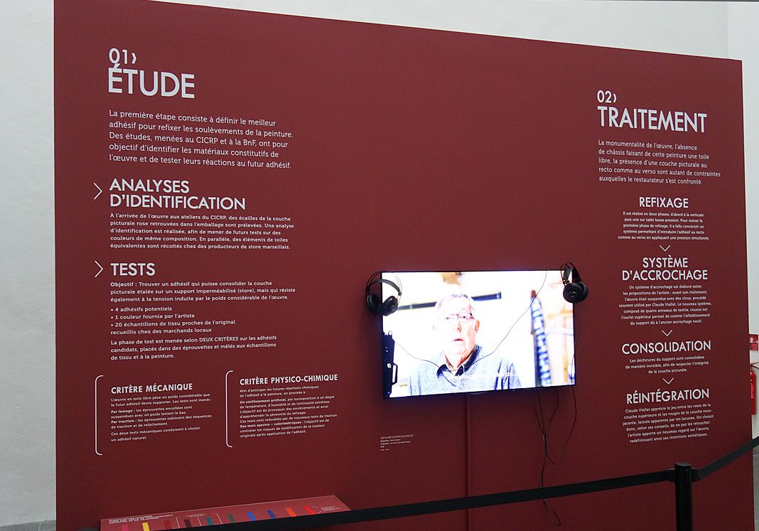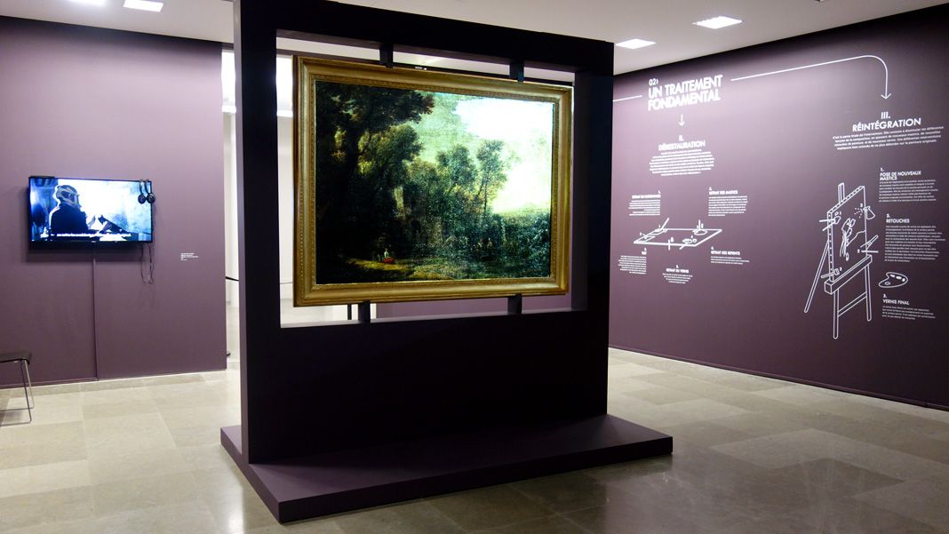 Dans le cadre de l’exposition, l’œuvre est présentée dans une cimaise permettant de découvrir la face peinte comme le revers du tableau, révélant son doublage, son châssis réglable ainsi que ses bandes de tensions. Grâce à un système de projection lumineuse par superposition d’images (mapping), l’état ancien du tableau et les différentes étapes de sa restauration sont révélés.