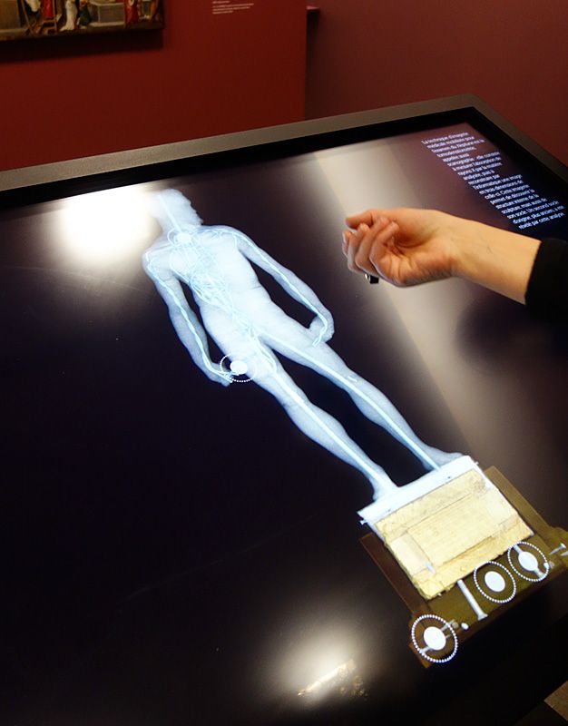 Cette première section présente sept œuvres, une huile sur bois, une huile sur toile, quatre dessins à l’huile sur parchemin et une sculpture modelée en cire. À l’aide de la table tactile, le visiteur peut établir leur constat d’état, découvrir toutes les analyses scientifiques dont elles ont fait l’objet (imagerie par rayon X, ultraviolets ou infrarouge…) et suivre leur processus de restauration. Les œuvres restaurées sont présentées sur les cimaises.