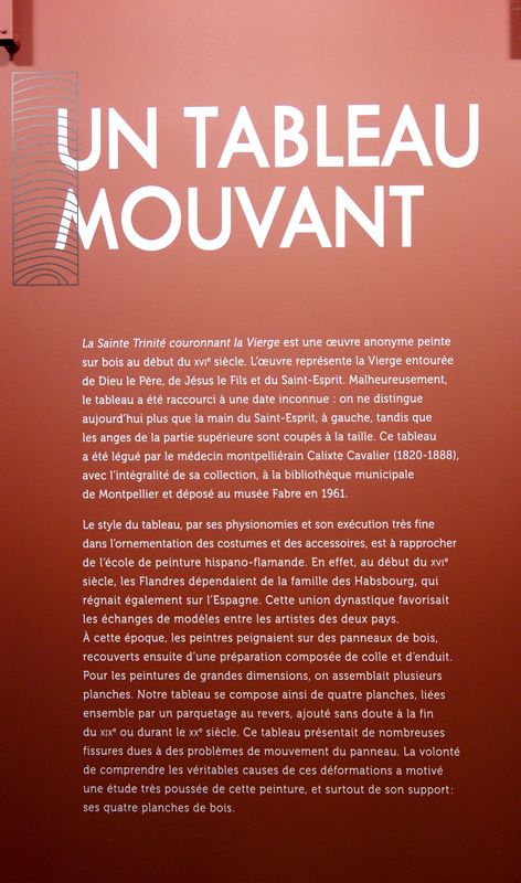 L’étude de « la Sainte Trinité couronnant la Vierge » est le résultat d’un partenariat entre le musée Fabre et trois universités : L’Université de Montpellier, Laboratoire de Mécanique et Génie Civil (LMGC) – Le Centre National de la Recherche Scientifique (CNRS) et l’Université de Poitiers, institut Pprime, département Génie Mécanique et Systèmes Complexes – Le Département de Gestion des Systèmes Agraires, Alimentaires et Forestiers (GESAAF) de l’Université des études Florence).