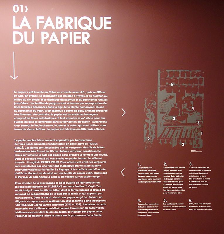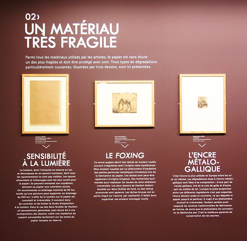 Cette exploration des deux dessins de Hackert permet dans le même temps d’expliquer la singularité du papier, et en particulier sa fragilité. Soumis à des risques d’altération du fait de la lumière et aux caractères néfastes de certains montages, parfois même de certaines encres, les dessins impliquent des normes de conservation plus délicates mais souvent méconnues.