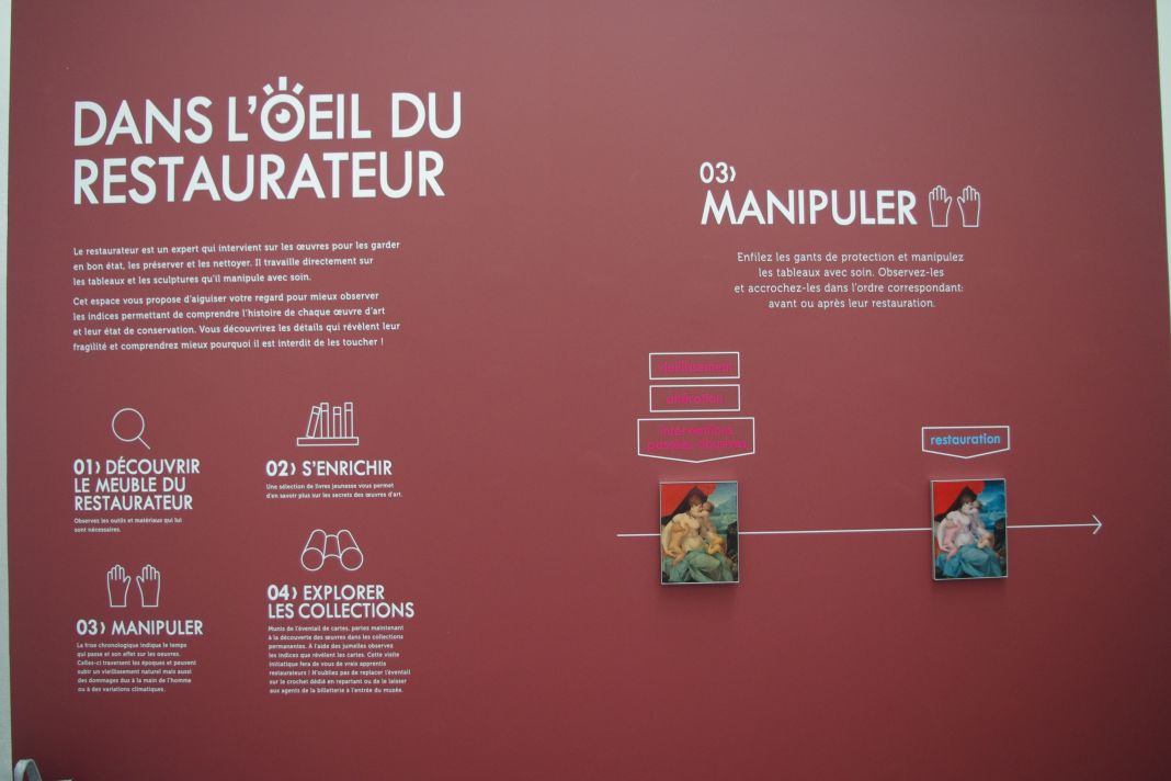 À la fin de ce discours très articulé, le service des publics propose une approche plus participative à destination des familles. Sous le titre « Dans l’œil du restaurateur », plusieurs activités ludiques et interactives sont suggérées pour « aiguiser le regard et mieux observer les indices permettant de comprendre l’histoire de chaque œuvre d’art et leur état de conservation »…