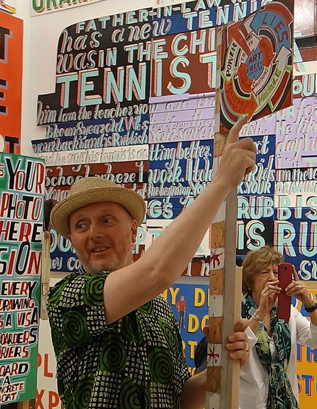 L’exposition « Activist » à La Panacée est annoncée comme « une rétrospective de ses activités, sous la forme d’une frise déclamative dans laquelle on trouvera des sculptures de légumes, un hommage à Amy Winehouse, et d’autres œuvres plus directement politiques, telle la lettre qu’il adresse au secrétaire d’Etat britannique à l’éducation, Michael Gove, dans laquelle l’artiste dénonce une politique entraînant la destruction de la créativité en Angleterre ».
