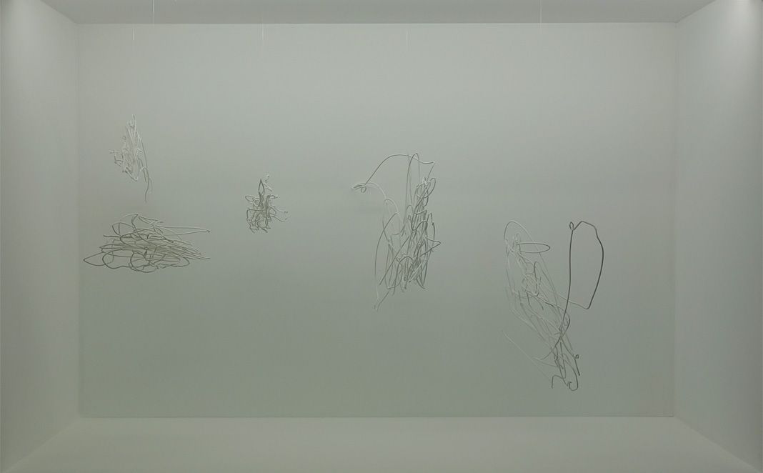 « Un paysage gris et mou m’accueille et se dérobe sous mes pieds… le sol en sable, balayé par mes pas, dessine et redessine indéfiniment la topographie du lieu… l’exposition s’imprime au passage de chaque visiteur, … tout autour des abeilles de verre produisent des sons stridents … scénographier des connexions synaptiques … Le sentiment d’être entré dans un paysage intérieur…, vivre dans une exposition comme dans une psychoarchitecture… Je me lève et je déambule à présent sous un réseau métallique… L’agencement est émotif, il est le fruit des humeurs de ses concepteurs puis de ses habitants. … une architecture de relations … des contagions et des coexistences … Les objets exposés sont eux-mêmes des “enregistreurs”, ils sont “chargés” de sens, de mémoires ».