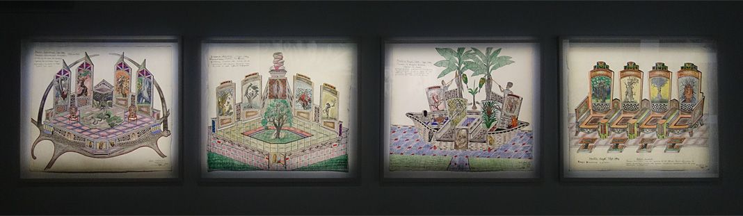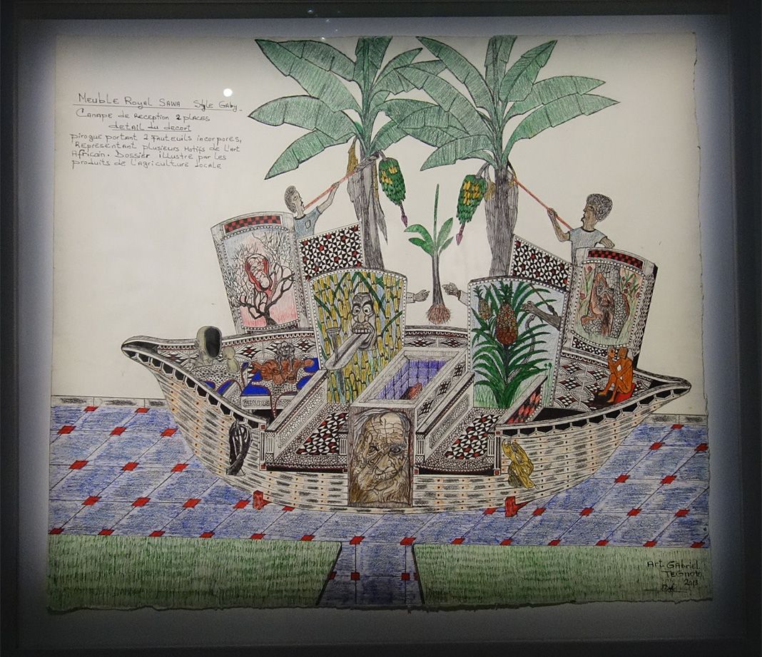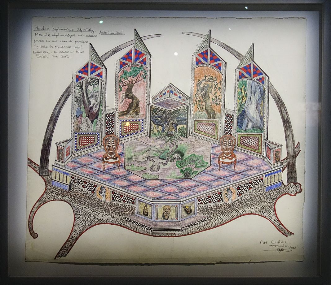 Gabriel Tegnoto expose quatre dessins au stylo bille, feutre et crayon sur papier aquarelle, projets de meubles royaux, diplomatiques et de panneaux décoratifs de « Style Gaby ».