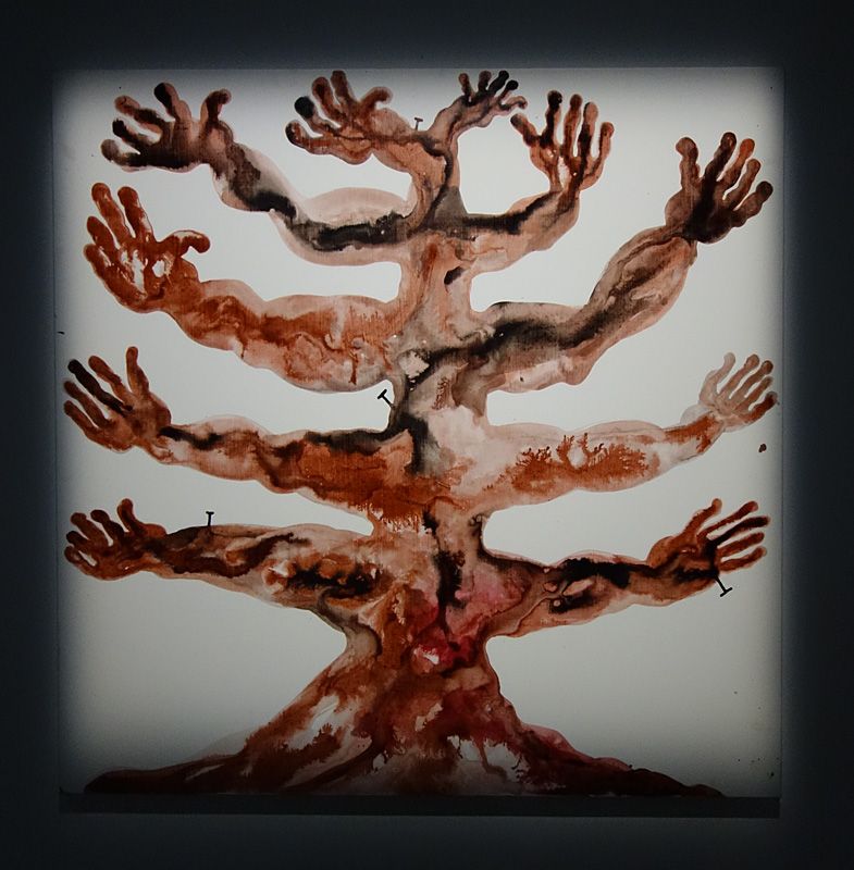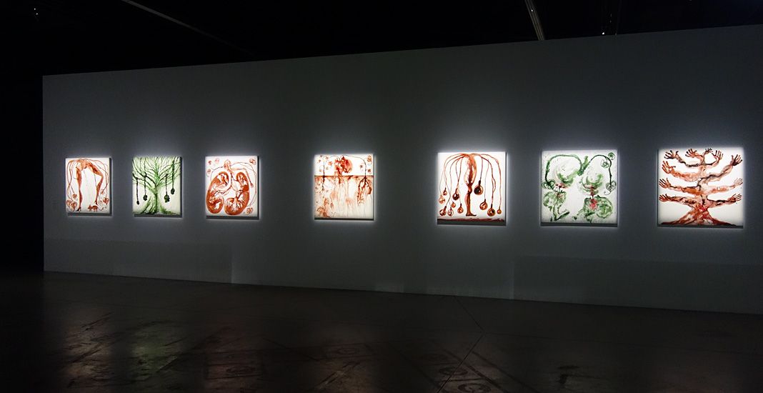 Ce décor s’harmonise assez bien avec les encres vertes et rouges qui dominent dans la série « Homo Planta » présentée en face.