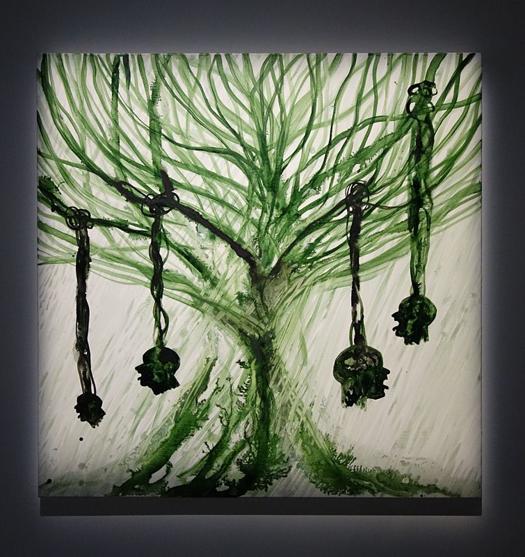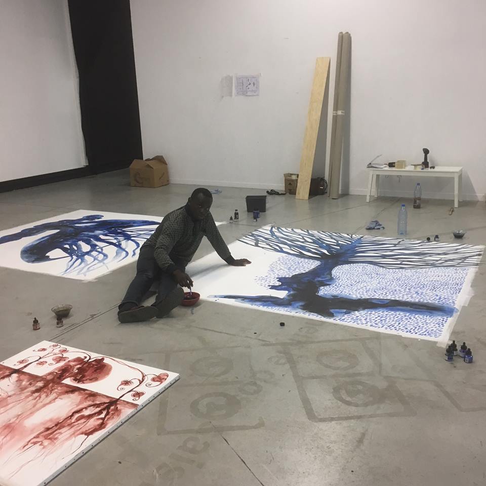Huit toiles de Barthélémy Toguo, suspendues deux à deux, viennent opportunément marquer une rupture entre ses œuvres celles de ces invités qui sont accrochées au fond de la salle.