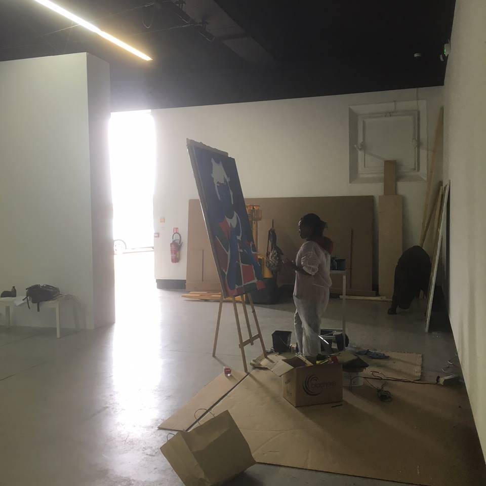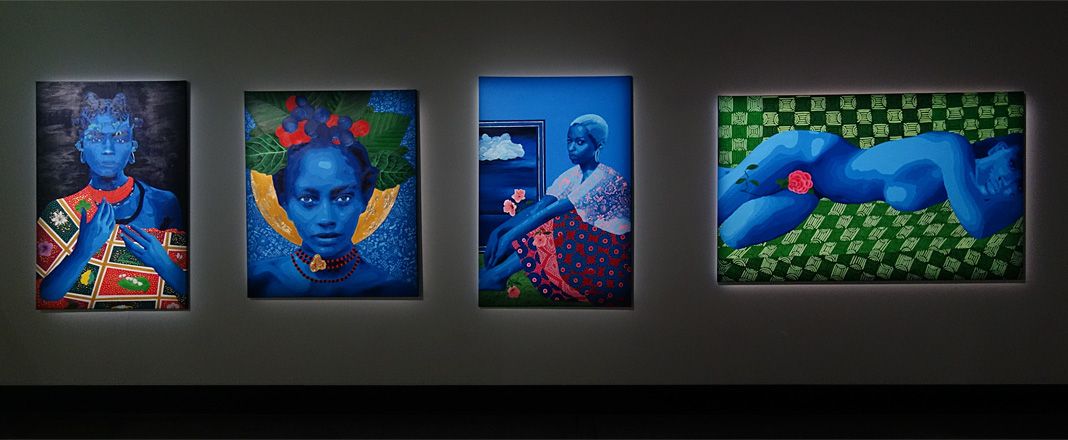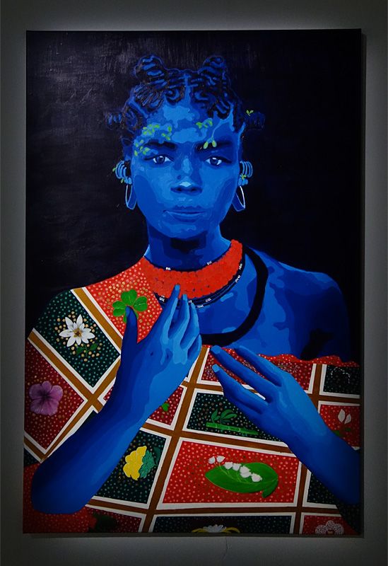 Sur chaque côté, le bleu s’impose dans deux tableaux aux dimensions plus importantes (200 cm x 200 cm). Sur la gauche, cette tonalité conduit naturellement le regard vers les œuvres de Moufouli Bello.