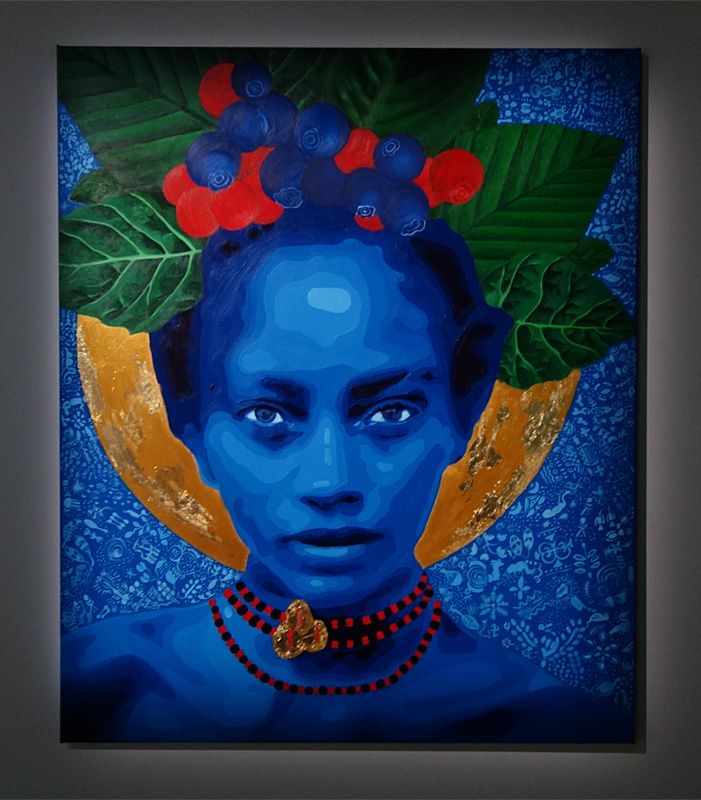 Moufouli Bello présente quatre portraits de femmes où elle mêle parfois peinture acrylique. feuilles d’or et stylos Posca.
