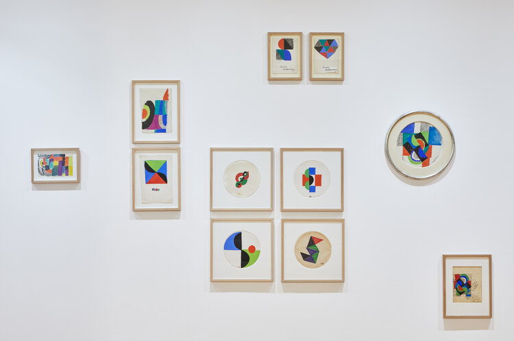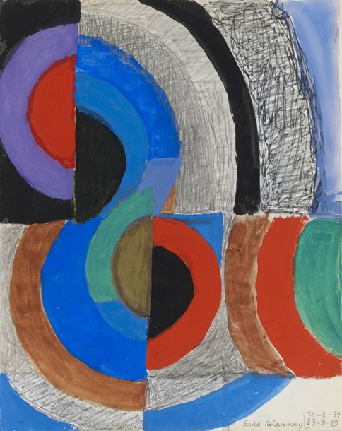 Un ensemble de près de 90 gouaches et dessins, intimistes et de format modestes, mais qui couvrent une large période de création, des années 20 à la toute fin des années 70, qui n’ont jamais été montrés et révèlent encore une fois la fraicheur et la puissance créative de celle qui fut appelée en son temps, avant les questionnements sur le genre, « la grande dame de l’art abstrait », bien qu’il y eut longtemps suspicion machiste d’une influence de Robert sur sa femme, alors qu’il est avéré que c’est Sonia qui amena notamment la couleur pure au couple depuis son Ukraine natale dont elle admirait l’art populaire aux couleurs franches. Toujours modeste, Sonia déclare dans le film « On s’influençait mutuellement parce que c’étaient les mêmes recherches » et Apollinaire (qui vécut chez eux quelques mois au moment du vol de la Joconde) de confirmer : « Les Delaunay, quand ils se réveillent, ils parlent peinture! ».
