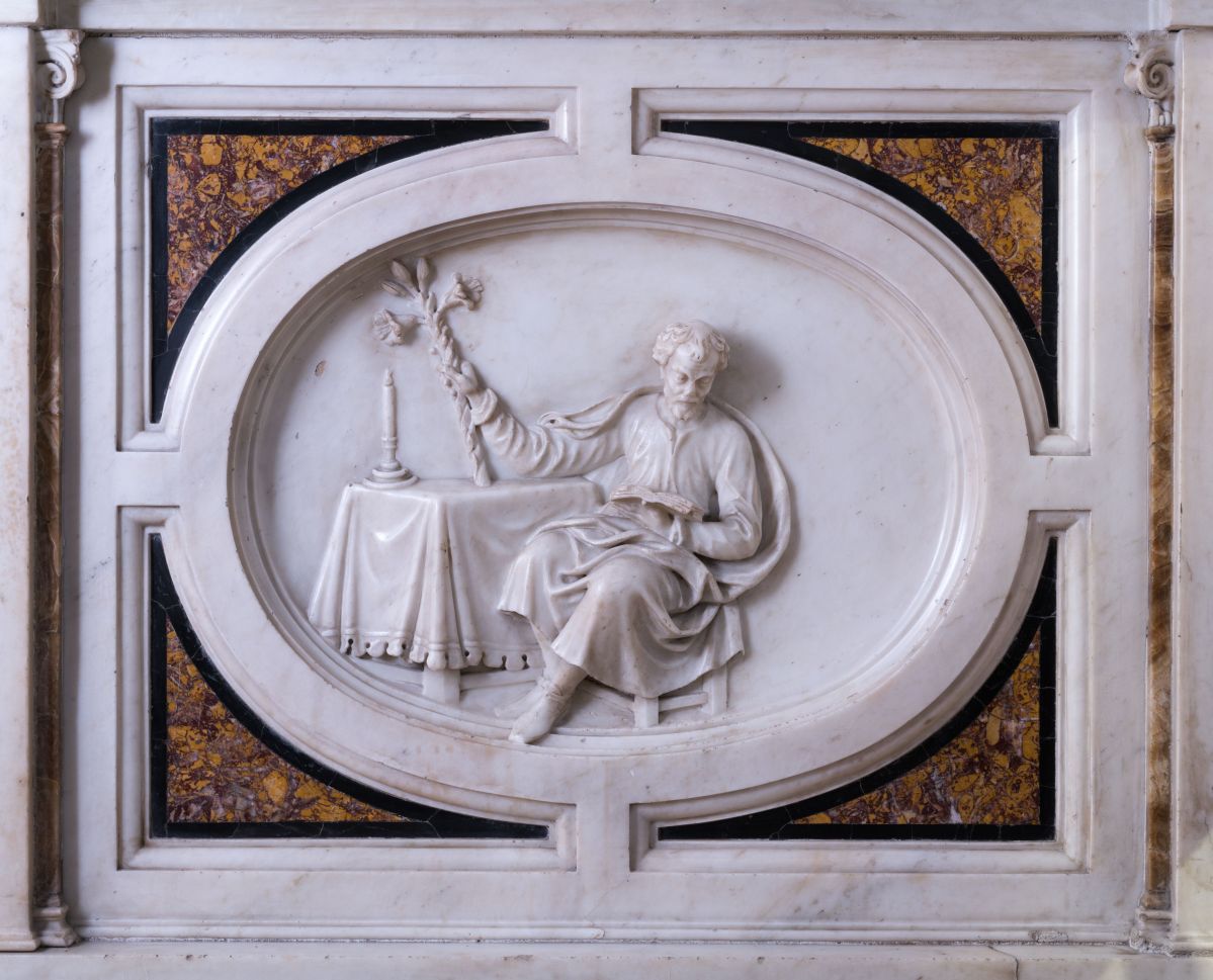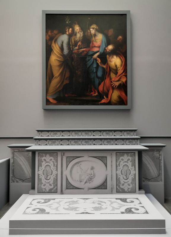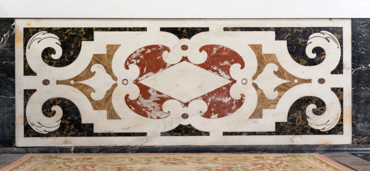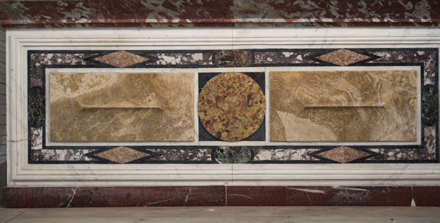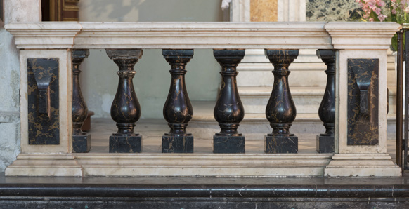 Sur un fond gris, les éléments du décor de marbres de couleurs aujourd’hui dispersés dans l’édifice religieux sont évoqués dans leurs positions d’origine par un discret et élégant dessin en grisaille : marbres et bas-relief de l’autel, tapis de marbre du marchepied, lambris de marbre du mur du fond et balustrade exécutés d’après un dessin de Pierre Puget par Francesco Macetti et son atelier génois vers 1998-1979.