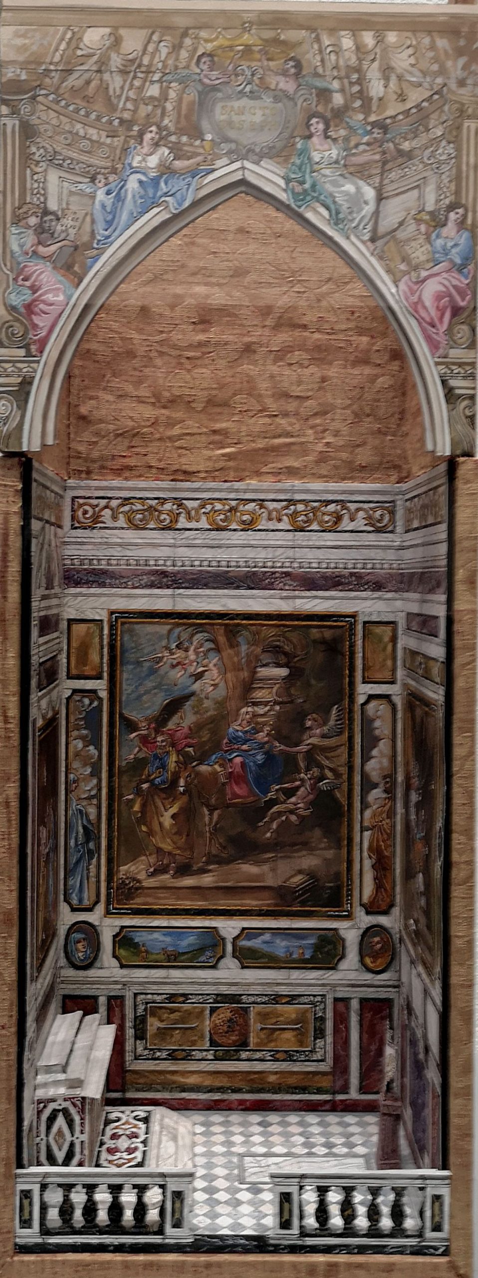 Le mur du fond est occupé par un tableau de Giovanni Battista Carlone, La Fuite en Égypte, dit aussi Le Miracle des dattes (1664).